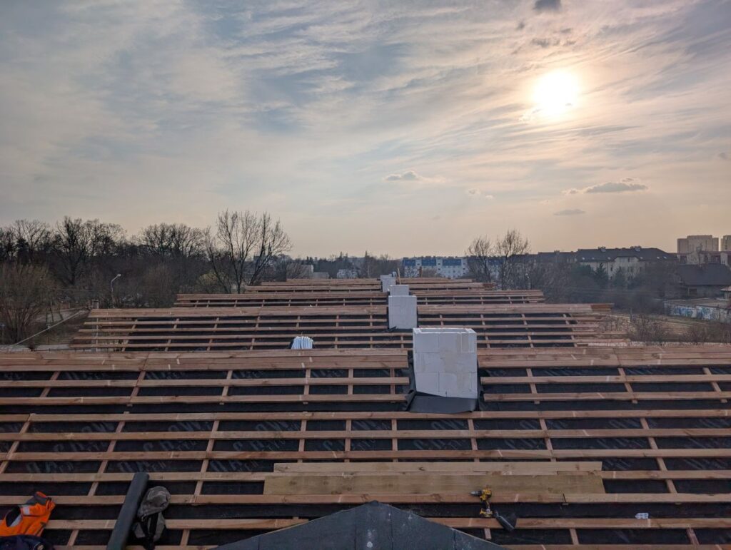 🔹 intensywnie pracujemy nad poszyciem dachu w szeregu B od ul. Pileckiego – jesteśmy już na zaawansowanym etapie.