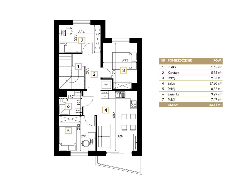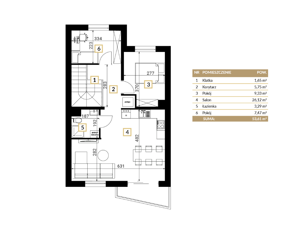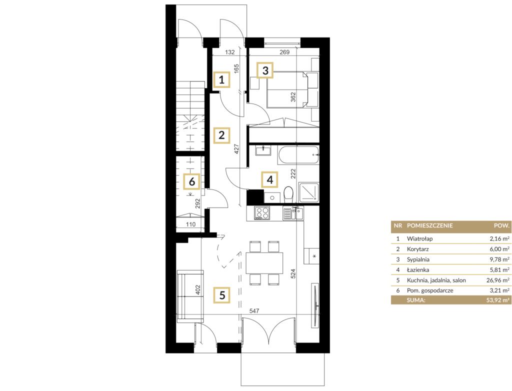 | A2 | 5 | 1 | 3 | 53.61m2 | 23.88m2 | Ogród i balkon | Sprzedane |