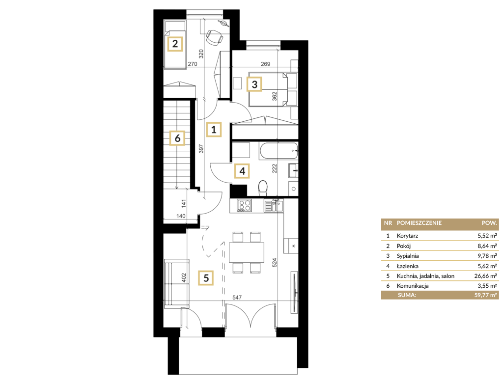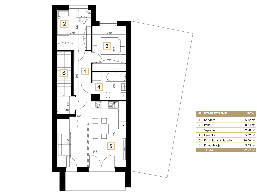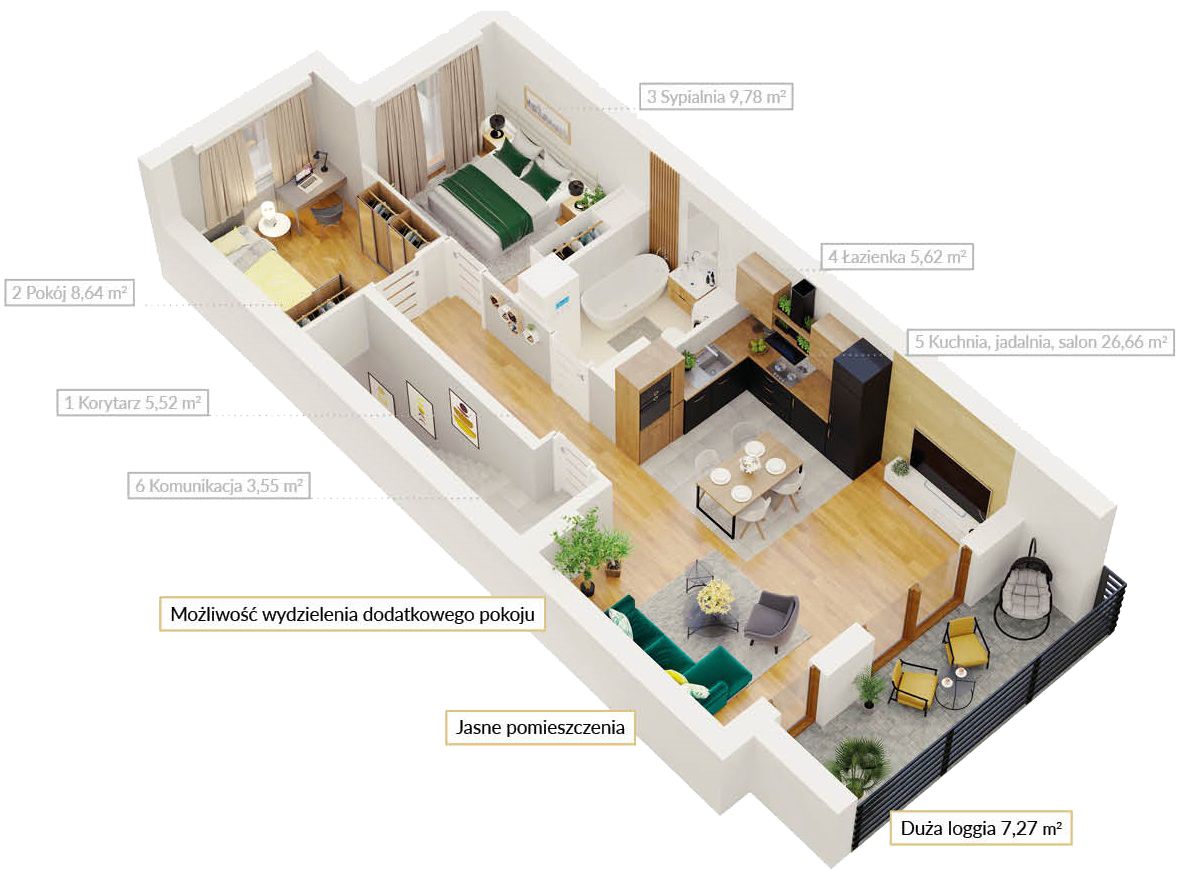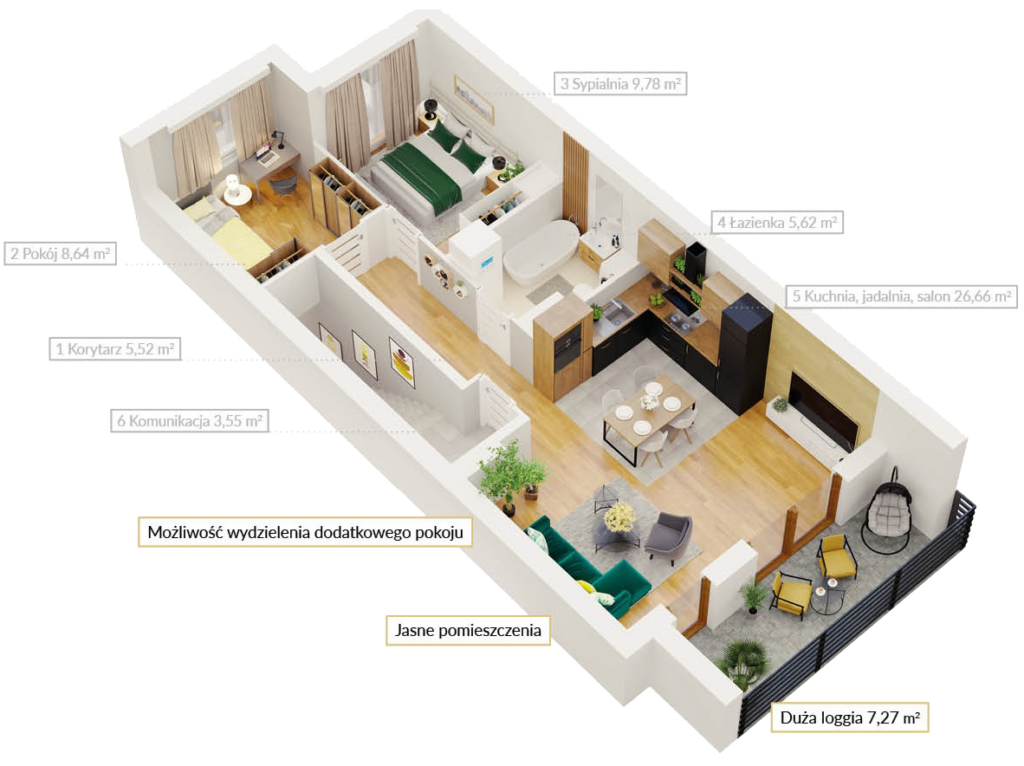 | 2B | D | 1 | 3/4 | 59.77m2 | 7.27m2 | Loggia | Sprzedane |