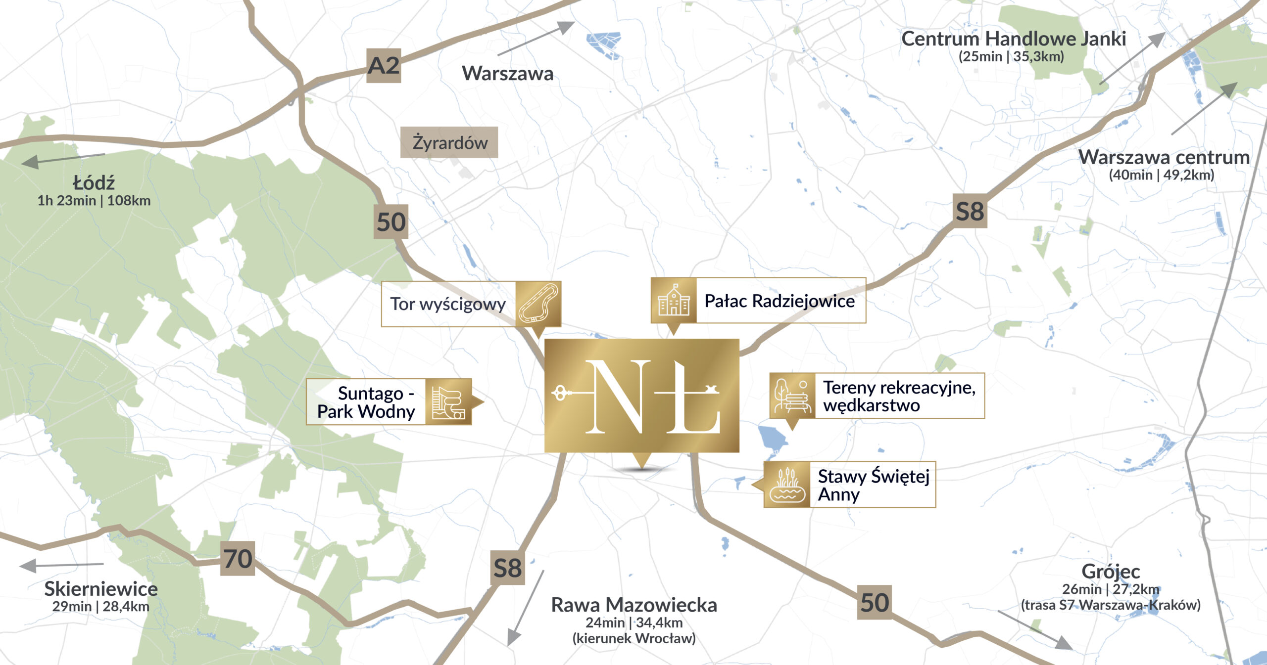 Nowa Ługowa zlokalizowana jest w Mszczonowie przy ul. Ługowej – w zielonej okolicy na końcu drogi wewnętrznej, co na co dzień gwarantuje spokój i ciszę. Trzeba podkreślić, że mimo podmiejskiego klimatu, inwestycja jest świetnie skomunikowana. Najbliższy przystanek autobusowy, dzięki któremu można dotrzeć do Warszawy, znajduje się przy ul. Wschodniej.