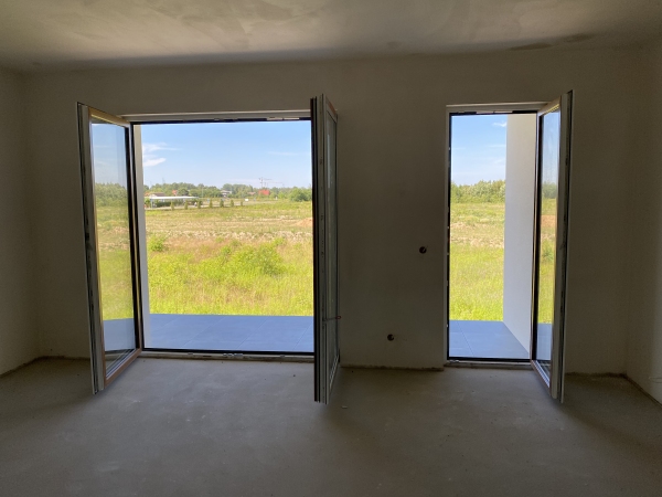 Ściany powstały z cegły silikatowej, która znakomicie wycisza oraz izoluje pomieszczenia. Wnętrza na całej powierzchni mają ogrzewanie podłogowe, zasilane nowoczesną pompą ciepła. To energooszczędne rozwiązanie, zapewniające wysoki komfort termiczny.